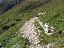 Was ich an den bisherigen zwei Tagen noch nicht gemerkt hatte war, dass sich Andi offenbar von der diesjährigen Transalp gänzlich unterfordert gefühlt hatte. Anders konnte ich mir den raffinierten taktischen Schachzug nicht erklären, als er – um für sich selbst den Schwierigkeitsgrad künstlich zu erhöhen – seinen Helm (natürlich mit vollster Absicht) auf der Enzianhütte liegen lies um dann im Anstieg umdrehen zu dürfen und so bereits gemachte Höhenmeter noch mal zurücklegen konnte.