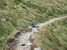 Auf das Schlüsseljoch folgte das Pfundererjoch, ein ewig langer Anstieg, der am Schluss zu einer ausgiebigen Wanderung wurde, da die Strecke nicht bis nach ganz oben fahrbar war. Schon vorher hätte die Transalp um ein Haar ihr Ende gefunden. Ein Rinnsaal von etwa drei Metern Breite und 10 Zentimetern Tiefe kreuzte unseren Weg, und Mirja weigerte sich standhaft diesen Amazonas der Berge ohne Fährdienste und David Hasselhoff als persönlichen Lifeguard zu überqueren. Da half kein Betteln und kein Flehen, erst als nach einer Viertelstunde eine Brücke aus Steinbrocken gefunden wurde konnte es weitergehen. Bei der Abfahrt vom Pfundererjoch konnte ich endlich meine enormen Downhillqualitäten voll ausspielen. Und nur ein Klassefahrer wie ich konnte es schaffen so mit dem rechten Pedal in den Erdboden einzustechen dass man wie von Zauberhand getragen über den Vorbau hinaus vom Rad steigt. Die Transalp hatte ihr erstes Sturzopfer. Ohne Schäden an Mensch (irrelevant) und Maschine (zum Glück) ging es weiter.