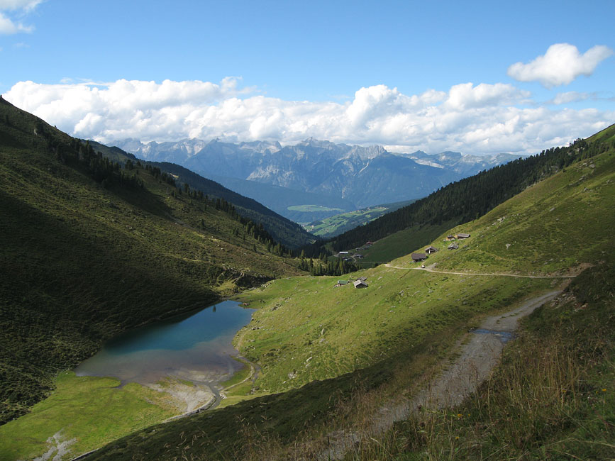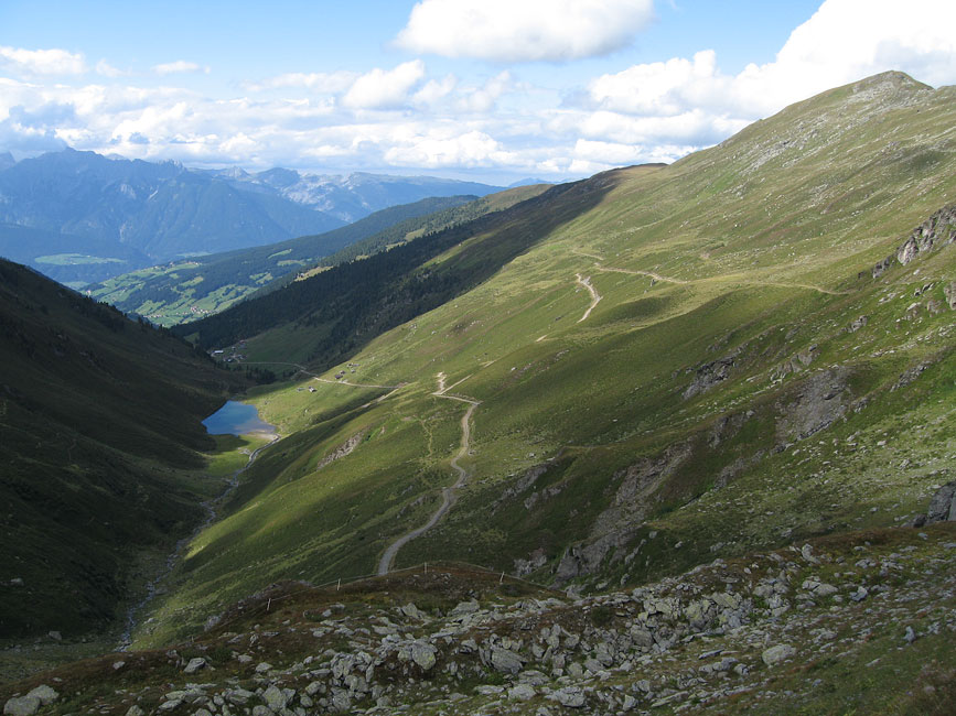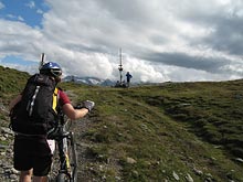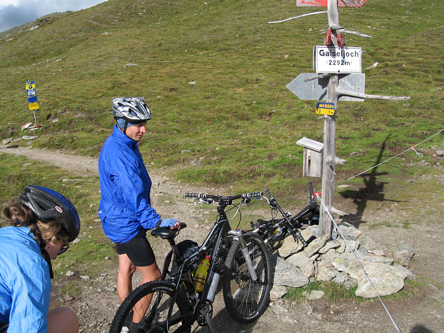 Als es dann in Schwaz aufs Rad ging und damit die eigentliche Transalp anfing fühlte ich mich eigentlich noch recht gut. Der unentwegt rinnenden Nase setzte ich die Erfindung des Tempomaten (ein Tempopapiertaschentuch eingeklemmt am Lenker) entgegen, und so ging es die ersten Kilometer noch völlig entspannt den Berg hoch. Doch irgendwann nach der Hälfte des Anstiegs fing es an beschwerlich zu werden, und so sehr ich auch versuchte die Grippesymptome als kleinen Hungerast, Durst, falsche Übersetzung, schleifende Bremse, Angriff der Aliens und vieles vieles mehr abzutun, so musste ich mich doch irgendwann mit der Tatsache abfinden, dass ich den Rest des Tages wie ein Hund leiden würde. Als ich endlich das Geiseljoch erreicht hatte war mir kalt, ich war müde, die Glieder schmerzten und ich hatte ein tiefes inneres Verlangen danach mein Fahrrad einfach den Abhang hinunterzuwerfen um dann hinterher zu springen. Als Mirja und Andi dann einige Minuten später auch oben am Gipfel ankamen konnte ich es schon gar nicht mehr erwarten den Berg hinunterzufahren um die Qual wenigstens für diesen Tag zu beenden.